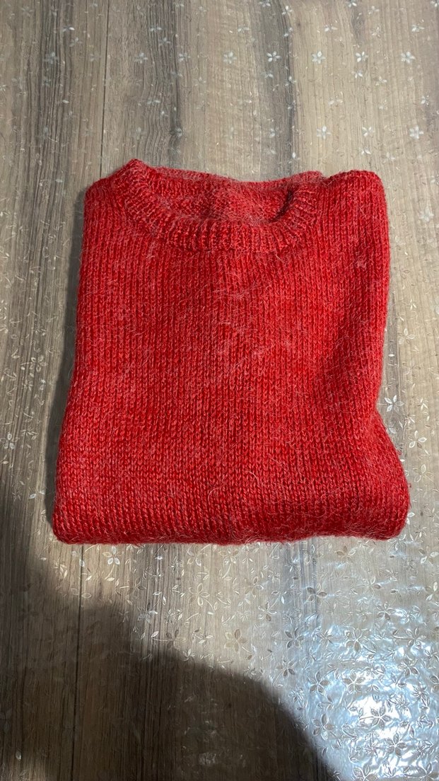 Kırmızı örgü kumaştan, yuvarlak yaka ve uzun kollu el örmesi kazak. Sadece 1 kere giyinildi.