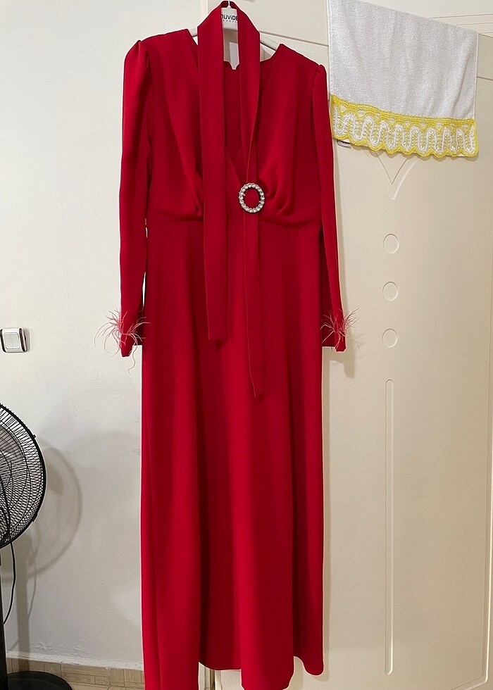 Kırmızı kalem elbise çok şık kemerli tüy detayları var 40/42 uyumludur