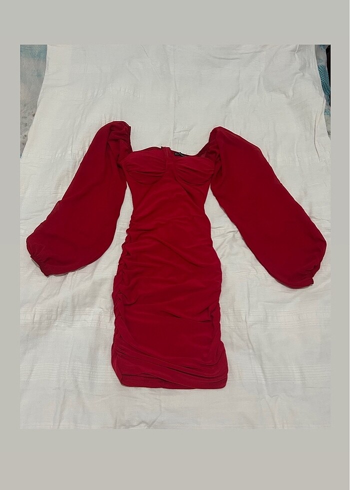 S beden. Kolları tül, etek kısmı kenarları büzgü detaylı kısa elbise. Arkası fermuarlı.Hiçbir sorunu yoktur. Sadece bir kez giyildi.