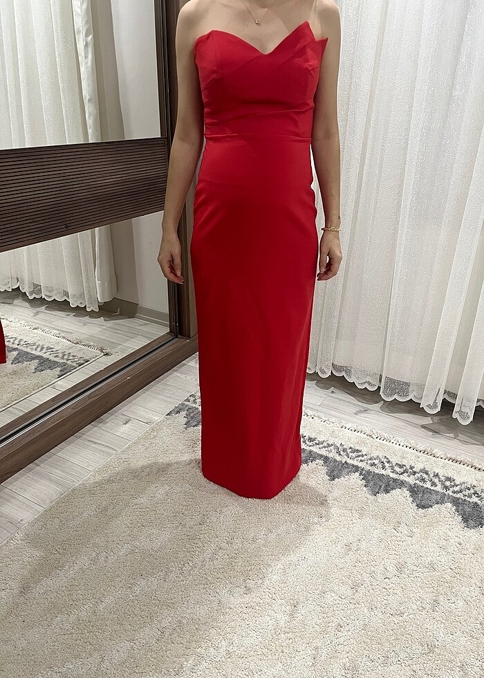 Straplez arkadan yırtmaçlı midi boy dar elbise