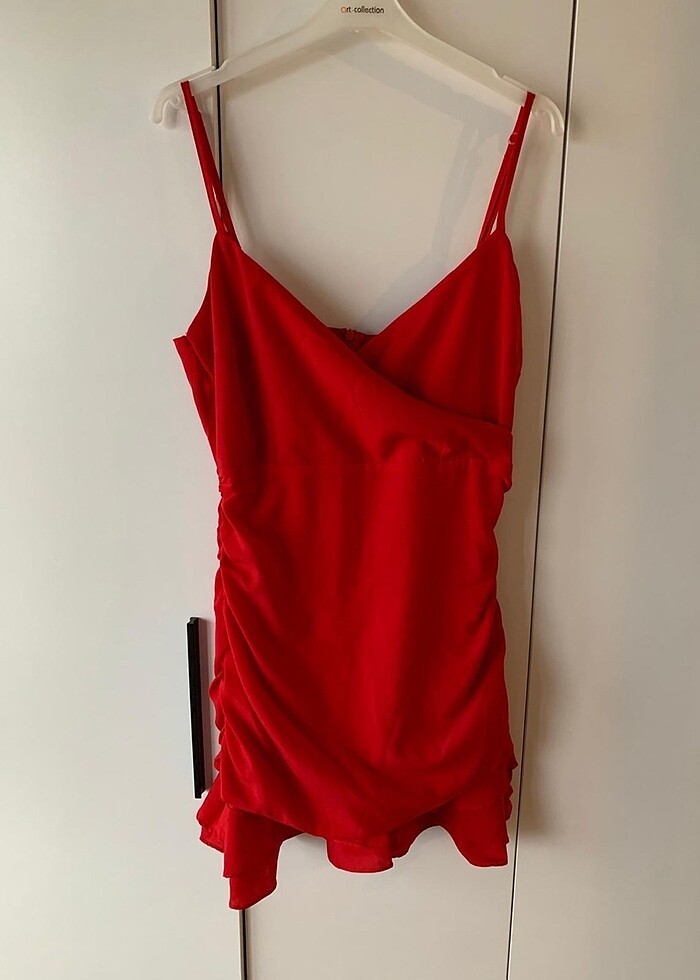 Hiç giyilmedi şık bir elbisedir, satenimsi bir kumaşı vardır. Etek kısmı fırfırlıdır. Askılarından birinin arkasında ters bir dikiş var. Ben de aldıktan sonra fark ettim ama görülen bir şey değil.