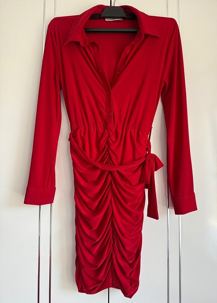 Hiç giyilmedi. Beli lastikli vişne çürüğü gibi hoş bir rengi var. Boy 90cm, bel 35cm.