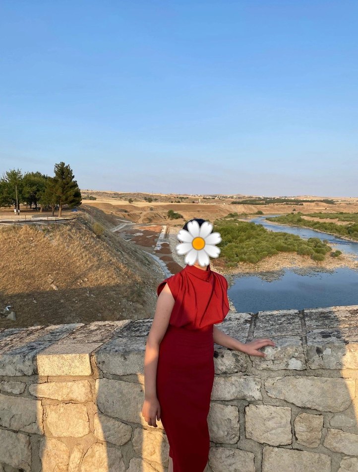 Yüksek yakalı, etnik desenli, drapeli, kırmızı midi elbise. Kolsuz ve vücuda oturan kesim.ozel günler ve Düğünler için uygun.
