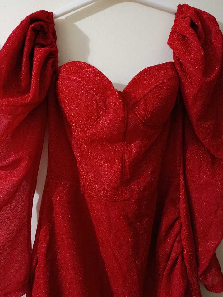 Kırmızı simli şık bir elbise 1 sefer giydim M-L bedene uygundur