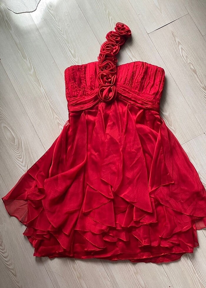 Elbiseyi sadece bir kez düğünde giymiştim ve oldukça şık bir parça. Elbise, mezuniyet gecesi, kına gecesi, düğün, nişan gibi her türlü özel geceye uygun. Gül detayları oldukça zarif bir şekilde işlenmiş. Arka tarafta, güllerin yapıştırıldığı yerleri görmek mümkün ancak tamamen sağlam bir şekilde yapıştırıldıkları için kopma gibi bir sorun olmayacaktır. Eğer olursa da oldukça kolay bir şekilde tamir edilebilir. Güllerin arkası göğüs bölgesinin üst kısmına denk geldiği için, herhangi bir yapışkan izi ya da benzeri bir şey görünmez. Elbise 2 numara yani medium bedendir. Ön kısmında çok ufak, belli belirsiz bir leke var, ancak bu durumu fotoğrafta da gösterdim. Eğer alırsanız, bir kez kuru temizlemeye vererek elbiseyi tertemiz bir şekilde uzun süre rahatlıkla giyebilirsiniz. Ben taşındığım için buna vakit ayıramadım ve bu yüzden satmaya karar verdim.