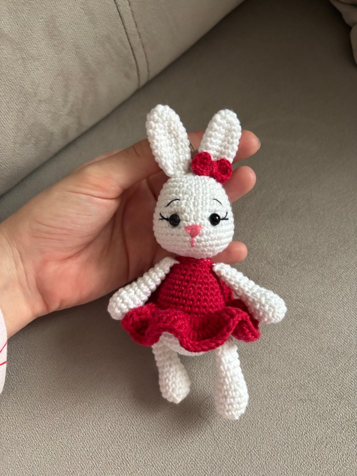 Kırmızı elbise ve toka takmış, detaylı yüz ifadelerine sahip renkli örgü tavşan bebek. süs ya da anahtarlık olarak kullanılabilir.