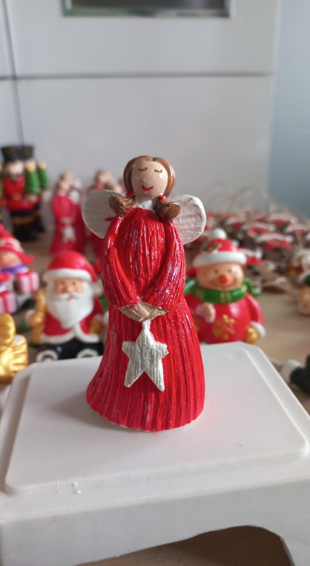 Kırmızı elbiseli, beyaz kanatlı ve örgülü saçlı melek biblo, beyaz bir yıldız tutuyor.