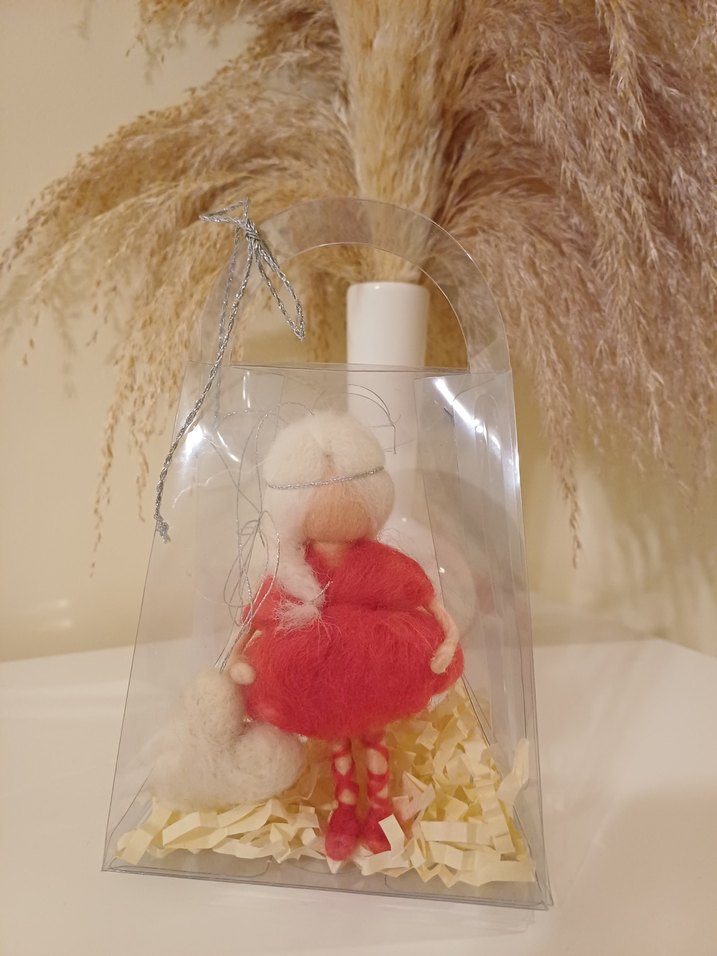 Kırmızı elbiseli, beyaz saçlı oyuncak bebek, şeffaf kutu içinde dekoratif kağıtlarla sunulmuştur. Yumuşak keçe dokusuna sahiptir. Sevgililer gününe özel ❤️
