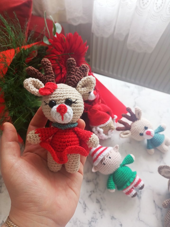 kırmızı elbiseli El Örgüsü Geyik 15 cm