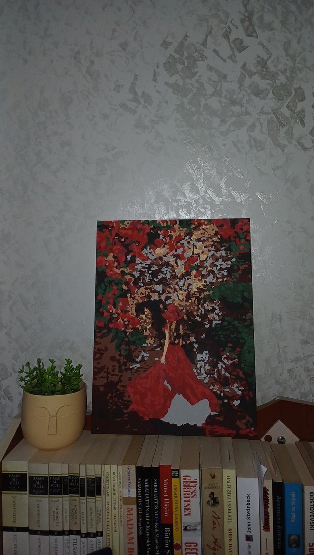 Koyu kırmızı elbiseli bir kadının soyut çiçek desenleriyle çevrili olduğu tablo, kitapların üzerinde yer alıyor.