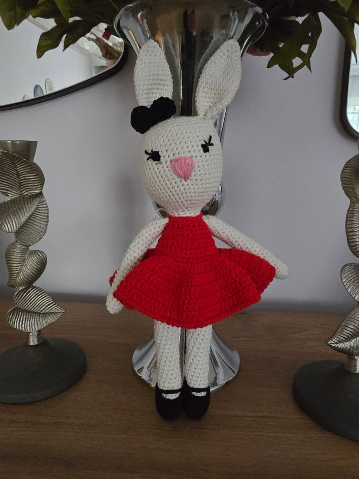 Kırmızı elbiseli, siyah ayakkabılı, örgü tavşan şeklinde renkli bir bebek. Gözleri kapalı ve bir kulağında küçük siyah fiyonk var.