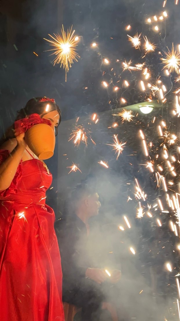 Kırmızı elbiseye sahip, renkli ve canlı renklere sahip 1 defa kınamda giydim deformesi yoktur