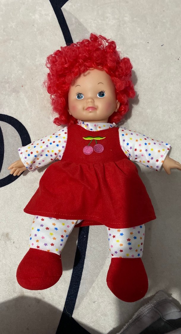 Kıvırcık kırmızı saçlı, yıldız desenli tulum ve kırmızı elbise giymiş bebek. Mavi gözlü, yumuşak yüz hatlarına sahip.
