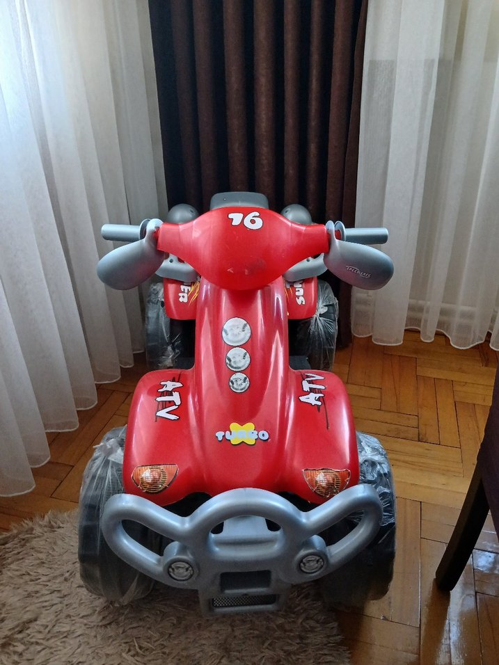 Renkli detaylara sahip kırmızı elektrikli ATV çocuk arabası. Dayanıklı yapısı ve kullanımı kolay kontrolleri vardır. İç ve dış mekan oyunları için uygundur. Dolu markadır. Küçük değildir.