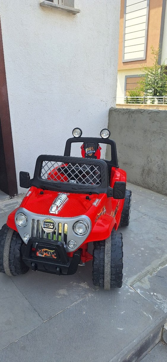 Çocuklar için büyük tekerlekli ve ön farlı kırmızı elektrikli binici araba. Rahat oturma yeri ve renkli tasarıma sahip.