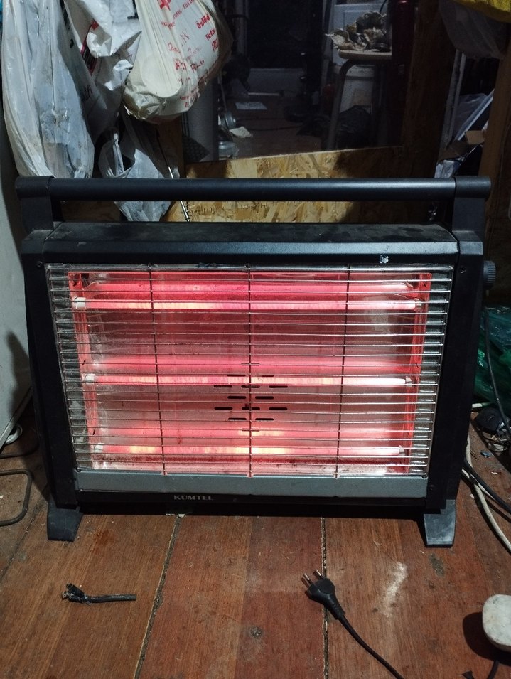 Korumalı ızgara ve taşıma kulplu kırmızı elektrikli ısıtıcı, içindeki ısıtıcı elemanlarla ısı sağlar.