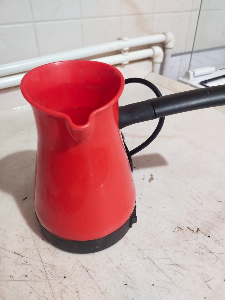 Kırmızı renkte, saplı ve dökme ağızlı elektrikli Türk kahvesi cezvesi. Geleneksel kahve yapımına uygundur. ☕ Su ısıtıcı olarak da kullanılır.