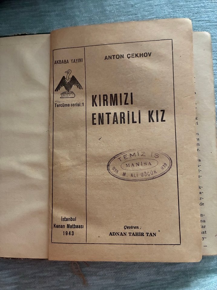 Anton Çehov'un "Kırmızı Entarili Kız" adlı kitabı, Adnan Tahir Tan çevirisi, 1943'te İstanbul Kenan Matbaası'ndan Akbaba Yayını olarak basılmıştır. 184 sayfa