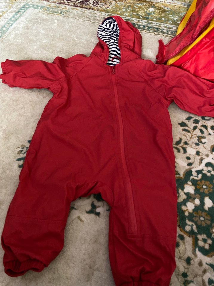 Koyu kırmızı renkte, fermuarlı ve yumuşak iç astarlı erkek bebek tulumu. Kapüşonun içi çizgili desene sahiptir. Dış yüzeyi su geçirmez.Hiçbir problemi yok sıfır ayarında 12-18 ay