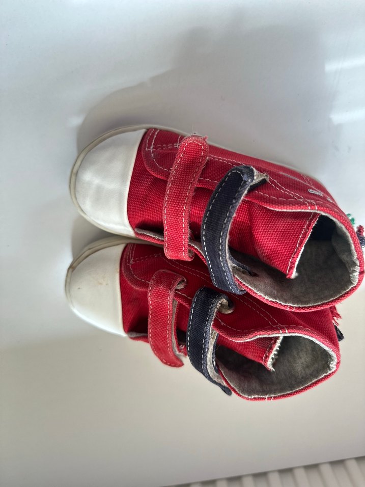 Kırmızı renk, cırt cırtlı, kauçuk tabanlı erkek bebek ilk adım ayakkabısı, renkli ve desensiz sokak stiline uygun.
