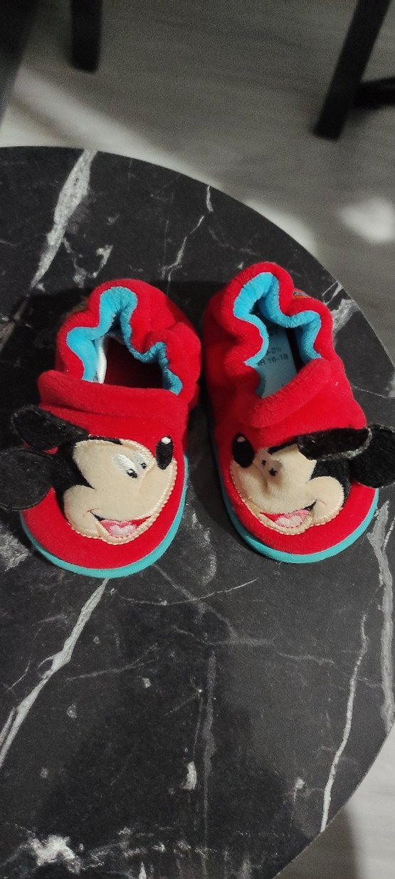 Yumuşak ve sıcak kırmızı erkek bebek ev ayakkabısı, renkli pop kültür nakışları ve kolay kullanım için cırt cırtlı bantlarla tasarlanmıştır.