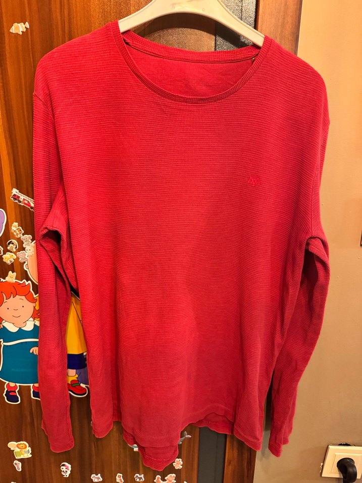 Kırmızı renkte, bisiklet yaka ve uzun kollu, bol kesim, normal boyda. Yumuşak ve sıcak bir kumaştan yapılmıştır. Günlük rahat sokak stili için uygundur.