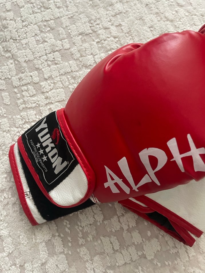 Kırmızı renkli, baskılı desenli, yumuşak ve sıcak kumaşlı erkek boks eldiveni. Velcro kapanışıyla güvenli kullanım sağlar. 'ALPH' yazısı bulunur.