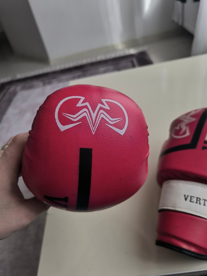 Kırmızı renkli, baskılı desenli erkek boks eldivenleri, güvenli kullanım için uygundur