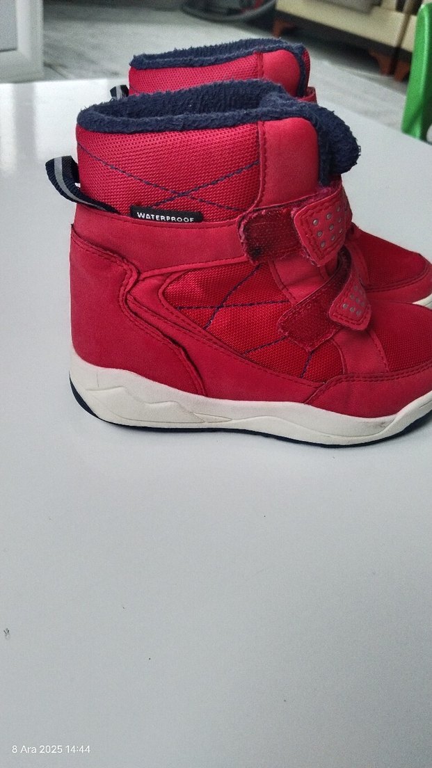 Kırmızı renkte, su geçirmez özellikli, velcro bantlı çocuk botu. Kauçuk malzemeden, rahat ve şık sokak tarzı ayakkabı. burun ucunda ufak aşınma var fotoğraflarda belirttim