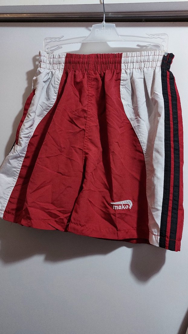Kırmızı, sentetik kumaştan yapılmış,erkek çocuk deniz şortu.