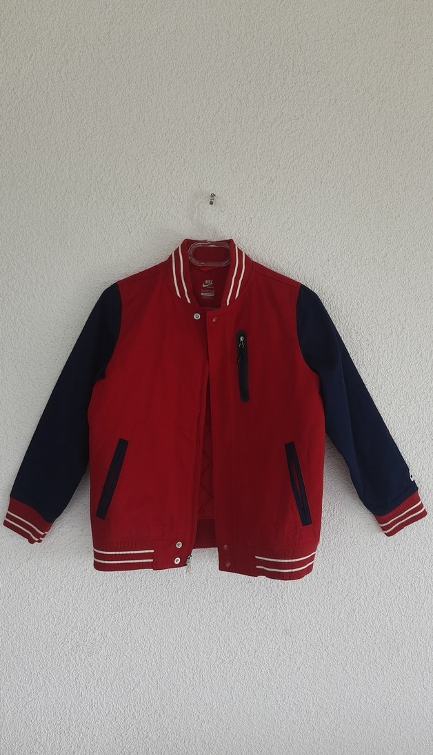 Koyu kırmızı gövde ve koyu kollara sahip, düğmeli ön ve çentikli yaka detaylı, yumuşak ve sıcak kumaştan yapılmış, erkek çocuklar için fitted ceket.