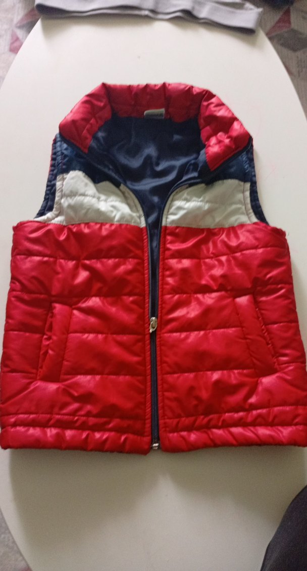Kırmızı ve lacivert renklerde, fermuarlı, yüksek yakalı ve yumuşak, sıcak kumaştan erkek çocuk yeleği. Sokak stili ve dar kesimdir.