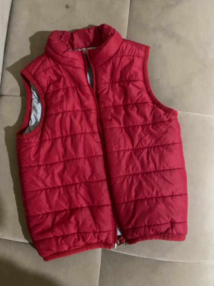 Kırmızı renkte, fermuarlı ve yüksek yakalı, yumuşak ve sıcak kumaştan yapılmış, ince kesim erkek çocuk yeleği.