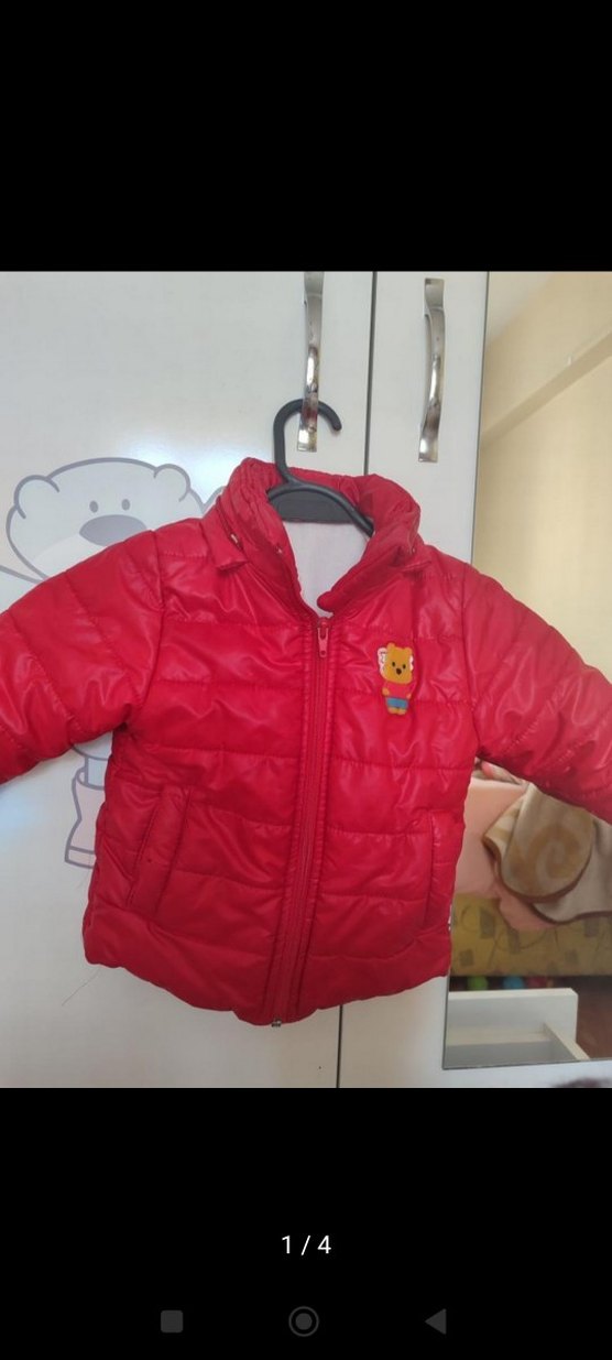 Kırmızı renkli, kapitone dikişli, düğmeli ve yaka detaylı erkek çocuk montu. Yumuşak ve sıcak kumaştan, renkli baskılı küçük bir figürle tamamlanmıştır.