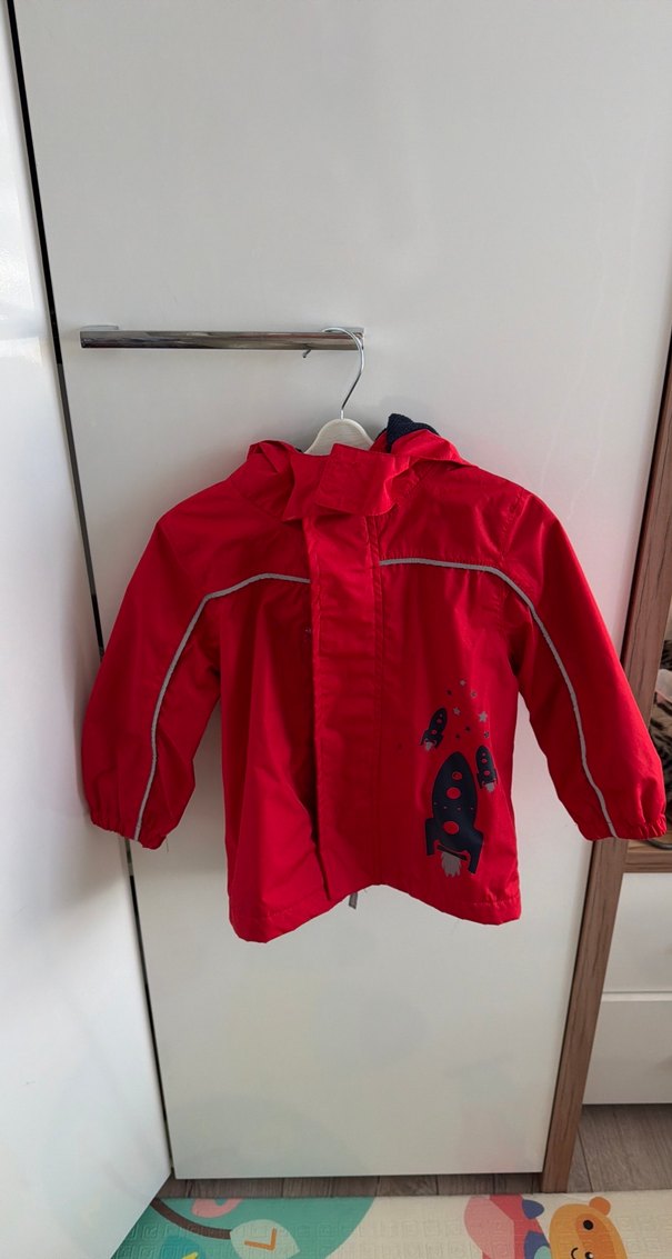 Fermuarlı ve yaka detaylı, kırmızı renkli, yumuşak ve sıcak kumaştan yapılmış erkek çocuk yağmurluğu. Sokak stiline uygun, sade roket desenli.