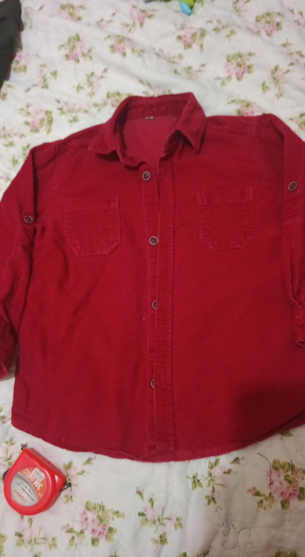 Kırmızı keten erkek çocuk gömleği, uzun kollu ve düğmeli ön detaylıdır. Notched lapel yakaya sahip, rahat kesimdir ve iki göğüs cebi bulunur.