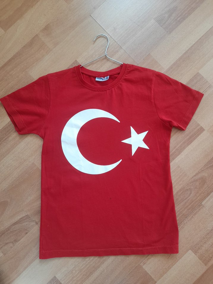 Kırmızı renkli, pamuklu kumaştan üretilmiş, rahat kesim ve bisiklet yaka kısa kollu erkek çocuk tişörtü. Üzerinde renkli ay-yıldız baskısı bulunur.