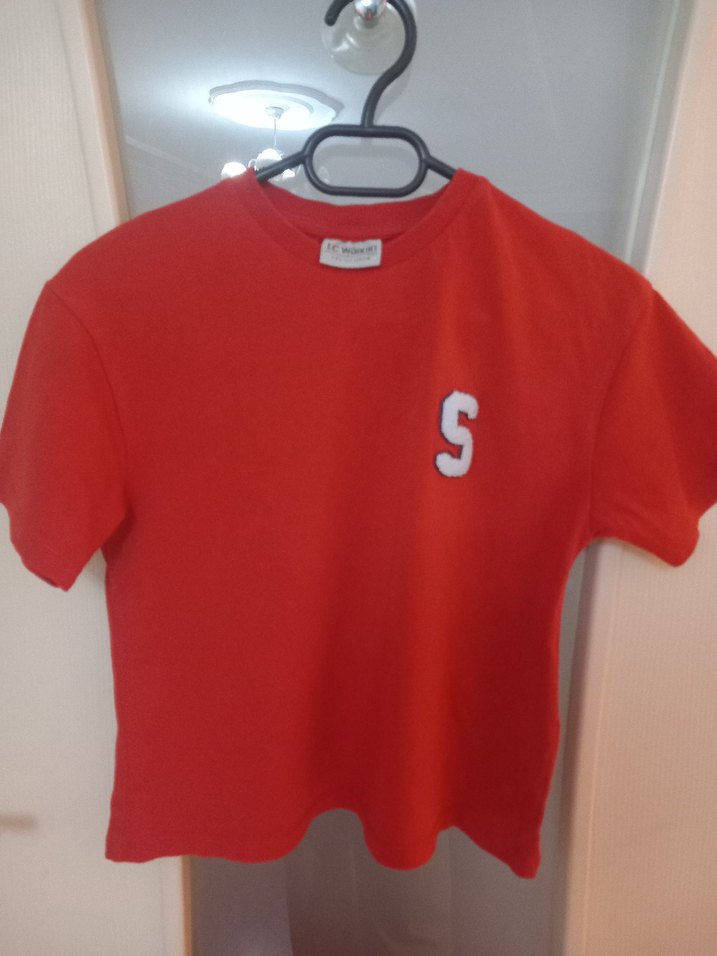Kırmızı renk, kısa kollu, bisiklet yaka erkek çocuk tişörtü. Önünde baskılı 'S' harfi var. Gevşek kesim ve parlak sentetik kumaştan üretilmiştir.