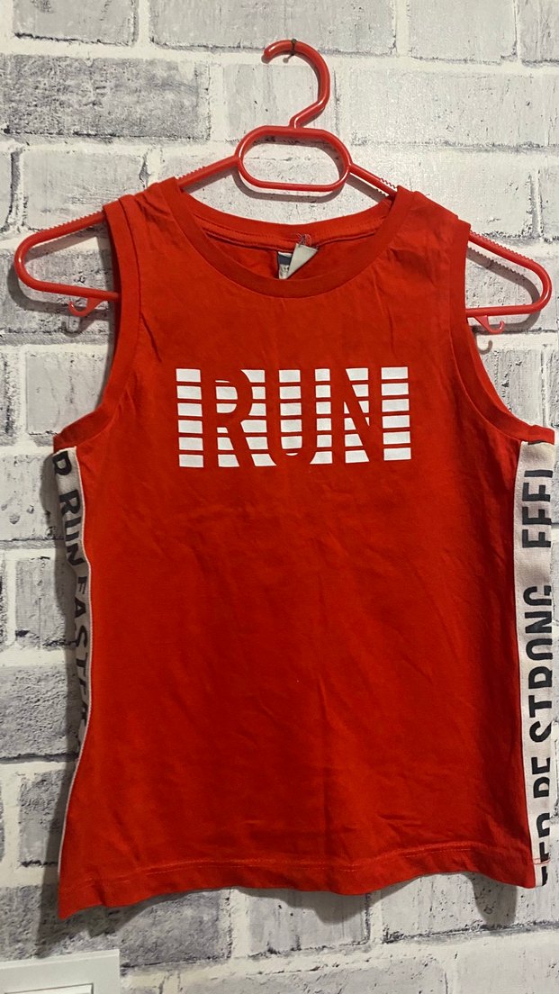 Kırmızı pamuklu kolsuz tişört, fitted kesim ve baskılı 'RUN' yazısı içerir. Yanlarda cırt cırt detaylarıyla sokak modasına uygun. ✨