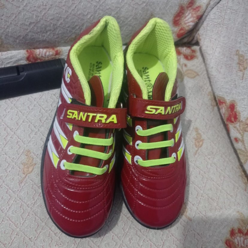 sıfır kullanilmamiş Kırmızı, renkli baskılı desenli, Velcro kapamalı, kauçuk malzemeden yapılmış erkek çocuk spor ayakkabısı. SANTRA markalı. halı saha ayakkabisi