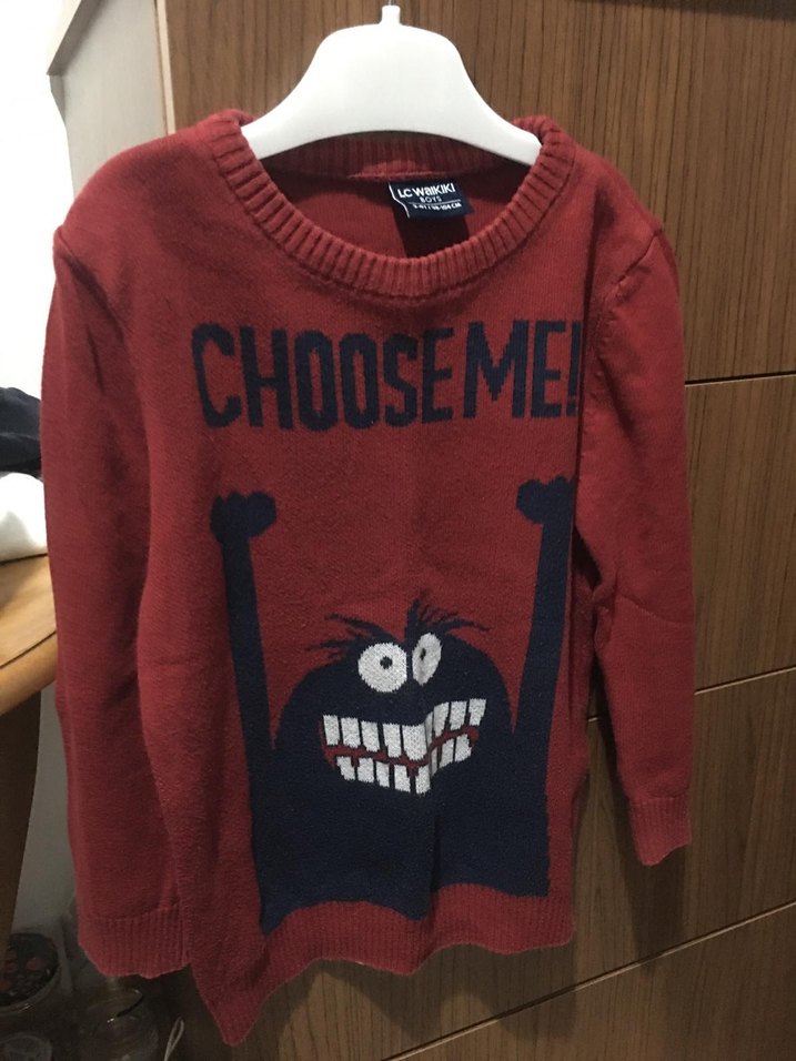 Uzun kollu, bisiklet yaka, yün örgü kumaştan yapılmış kırmızı erkek çocuk sweatshirt. Üzerinde 'CHOOSEME' yazısı ve baskılı eğlenceli desen bulunur.