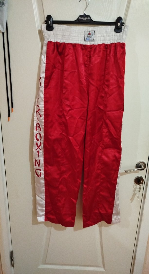 Kırmızı, parlak sentetik kumaştan, fermuarlı cepli ve beyaz yan panelli, "Kick Boxing" yazılı erkek çocuk rahat kesim eşofman altı.