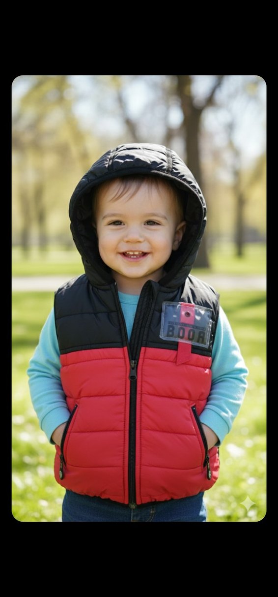 Renkli, fitted erkek çocuk yeleği, şişme tasarım, kapüşon ve fermuarlı ceplerle dikkat çekiyor, trend sokak tarzı için uygun. Yeni sayılır kullanılmadı sorunsuz 3 yaş yazıyor ama 1-2 yaşa daha uygun gibi ölçüleri eklidir #bebekmont#bebekyeleği#bebekhırka#bebekgiyimi