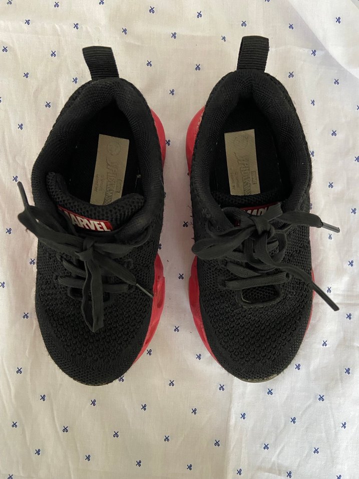 Koyu kırmızı kauçuk tabanlı, siyah üst kısmı ve Velcro kapamalı erkek çocuk spor ayakkabısı, trend sokak stili için uygundur.