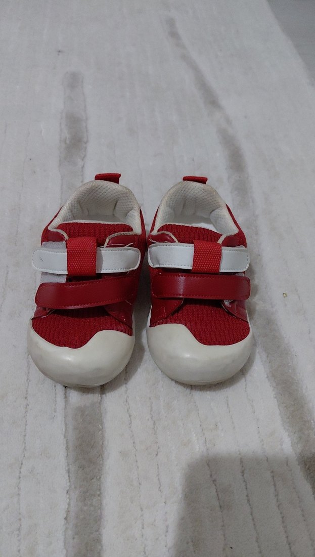 Kırmızı renkli, kauçuk tabanlı ve Velcro bantlı erkek çocuk spor ayakkabısı. Rahat ve kolay giyilir.