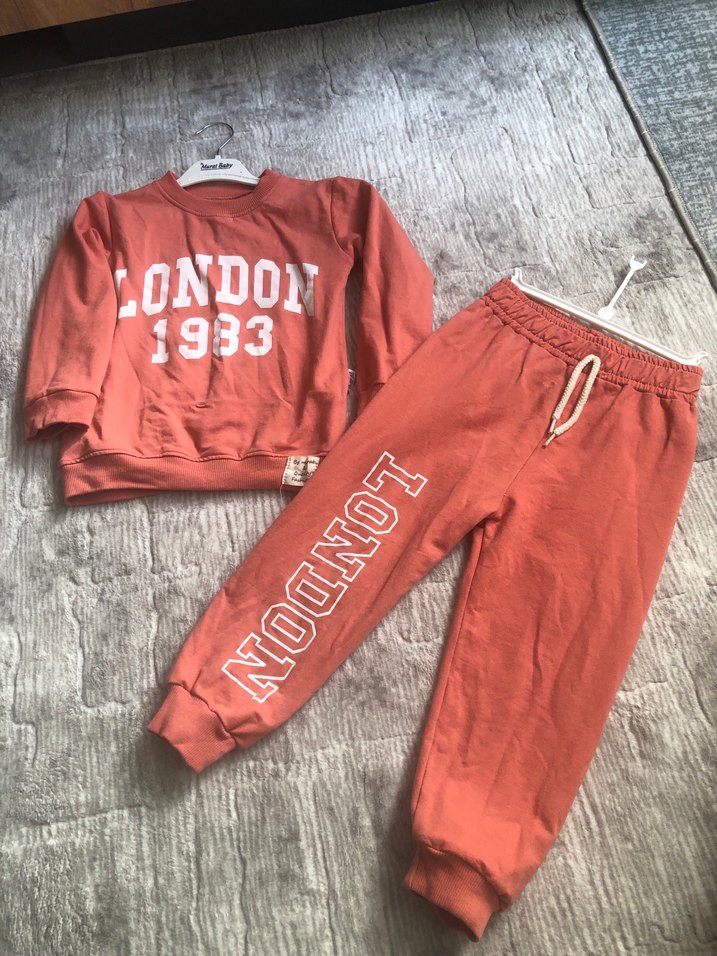 Erkek çocuklar için rahat kesim, kırmızı pastel tonlarında sweatshirt ve eşofman takımı. Üzerinde 'LONDON 1933' baskısı bulunan, yumuşak ve konforlu kumaş kullanılmıştır.