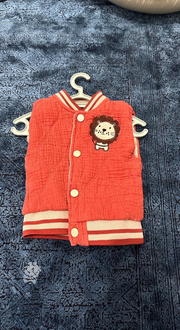 Kırmızı renkli, triko dokuma, baskılı aslan figürlü, kolsuz, fitted kesim erkek çocuk yeleği. Yuvarlak yaka ve çıtçıt düğmeli, sokak modasına uygun, yumuşak ve sıcak kumaştan yapılmıştır.
