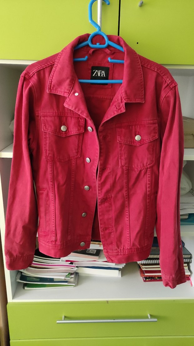Kırmızı denim kumaştan, düğmeli ve kesimli yakalı erkek ceket. Uzun kollu, normal kesim ve günlük sokak stiline uygun. Covid zamanında internetten almıştım, gönderirken alarmını sökmeyi unutmuşlar. herhangi bir mağazaya giderek halledebilirsiniz. son fiyattır