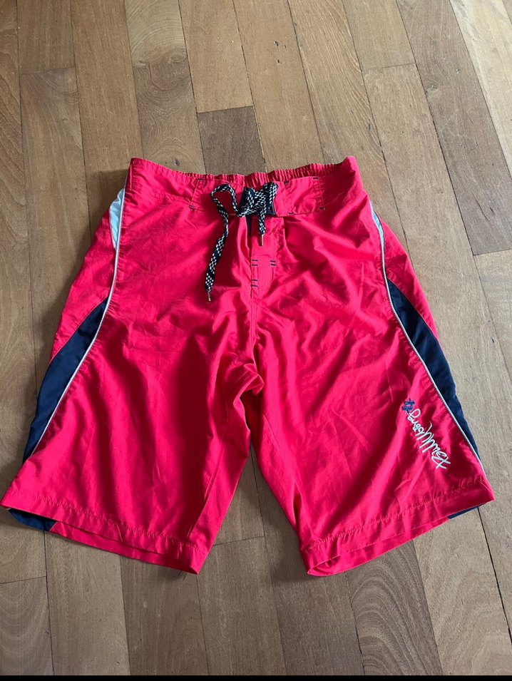 Kırmızı erkek deniz şortu, bol kesim, fermuarlı detaylı ve bağcıklı bel. Plaj ve günlük sokak tarzı için uygundur.