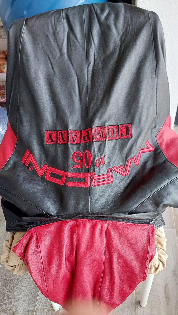 Kırmızı deri, fermuarlı, kolsuz, kesik yakalı, baskılı kadın biker ceketi. Sıkı kesim, midi boy ve cesur sokak tarzı ile spor dokunuşu sunar.